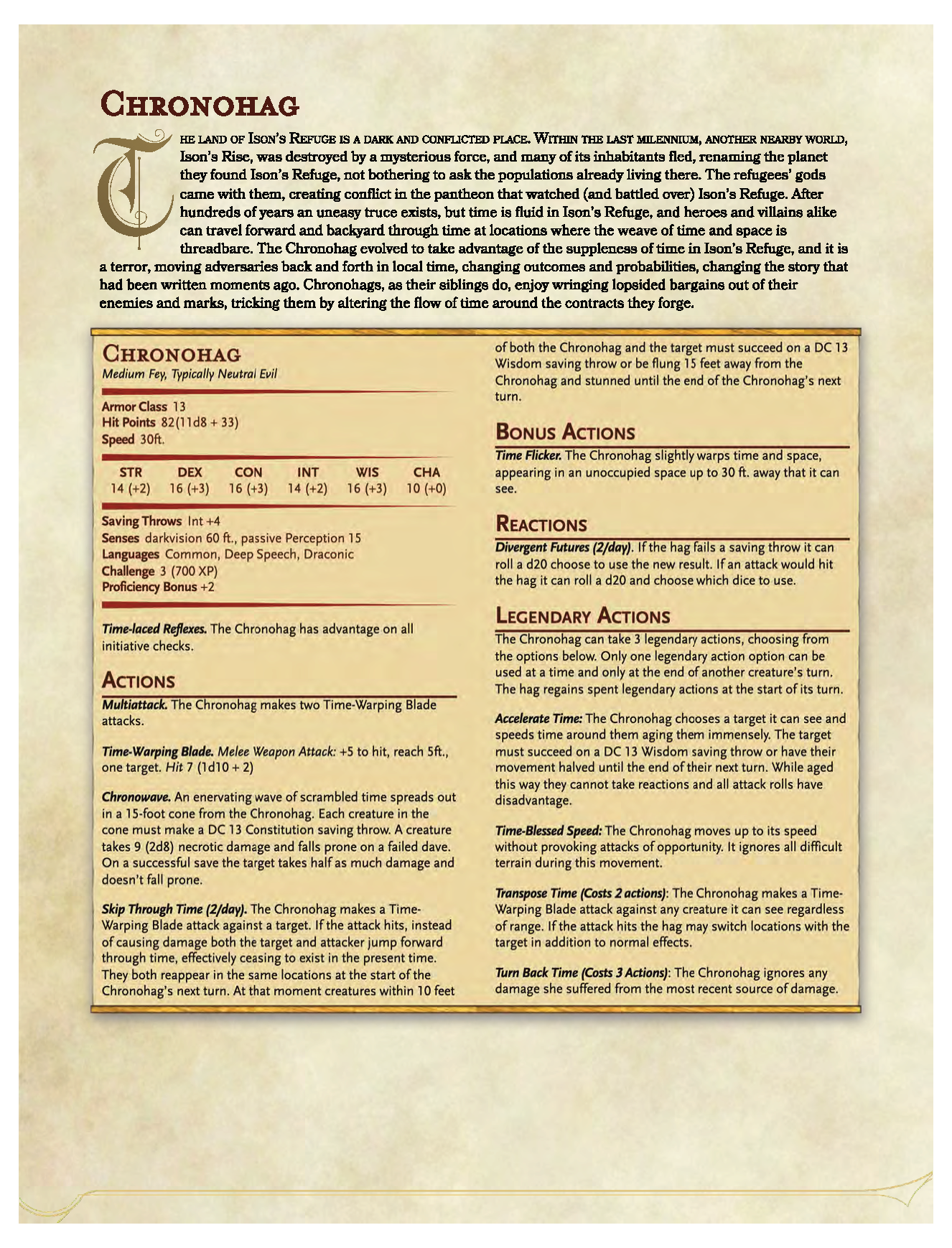 Building on last month’s post, Buffing Zarak, we return with another low-level monster with legendary actions. Why should high-CR monsters have all the fun? The way that 5th Edition action economy works, even low-level parties overwhelm single monsters with ease, and if you want to run some fun boss fights where the characters have to deal with only one tough foe you’re going to need to use legendary actions. Enter this month’s creation, the Chronohag. As we’ve talked about before, Aaron and Chris both play in each other’s games, and Aaron created the Chronohag as a boss-monster for our 2nd level characters in his excellent Ison’s Refuge setting (watch this space for future world-building in Ison’s Refuge). As a player, Chris remembers how difficult and unnerving the Chronohag was. “The hag kept moving around, moving us around, slipping attacks, limiting our movement and performing crowd control—we never knew if we were going to get out of this fight or if the hag was going to beat us. On the other hand, the Chronohag didn’t dish out tons of damage, so although we were worried only a few of us went down for short periods of time. It was an edge-of-your-seat battle, made even more interesting by the fact that none of us had any idea what Aaron had created.”